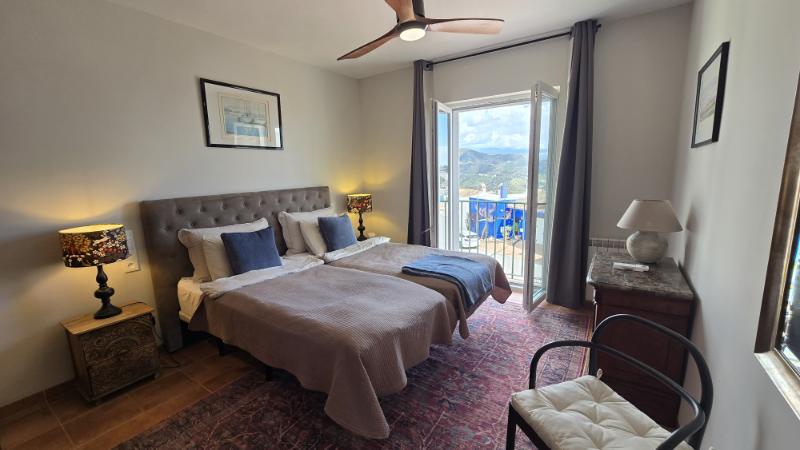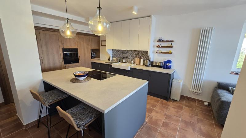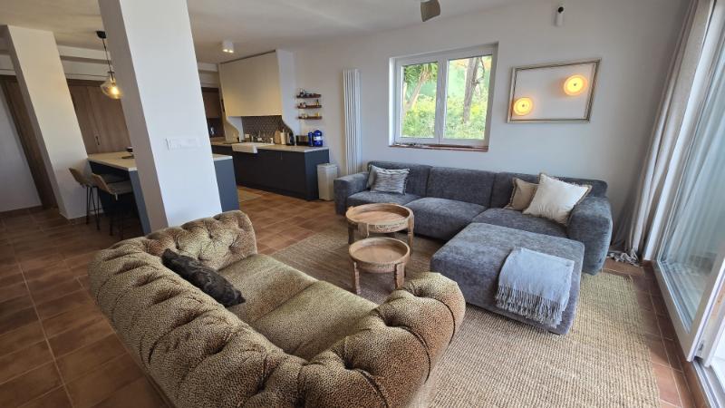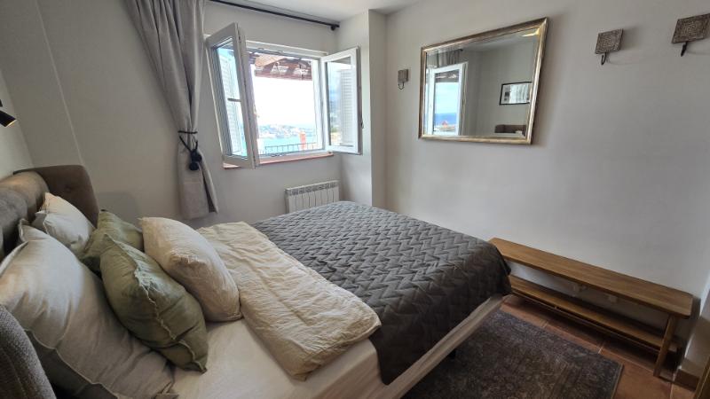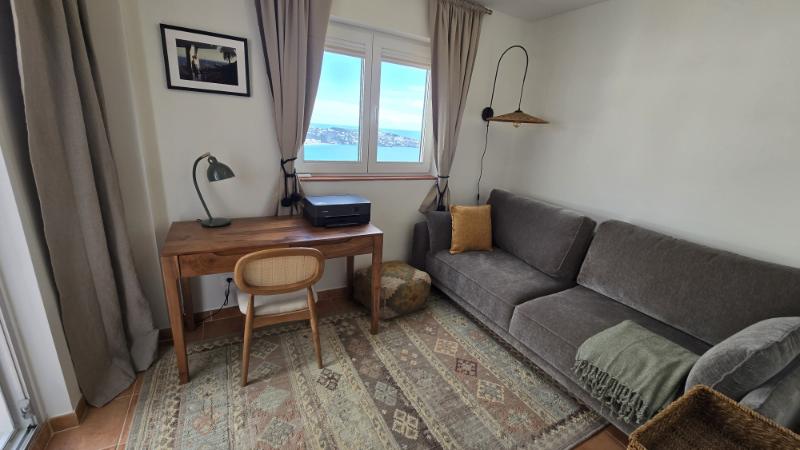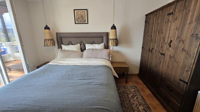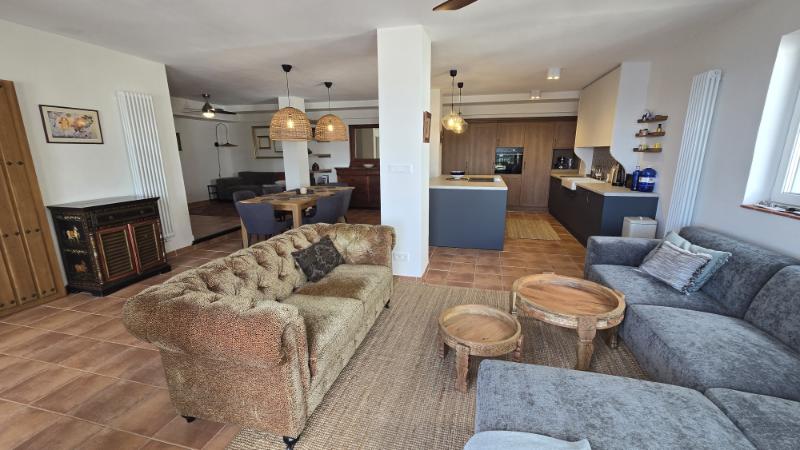 From the living room you can access a spacious panoramic terrace, ideal for outdoor dining, relaxing in the sun, or simply enjoying the stunning sea views and natural surroundings. The terrace is equipped with electric awnings, providing shade and comfort during the warmer hours of the day.