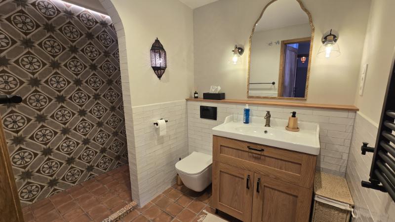 On this floor you will also find a guest toilet and a small office room, equipped with a desk and printer for guests’ use, as well as a sofa bed, allowing the space to also function as an additional sleeping area.