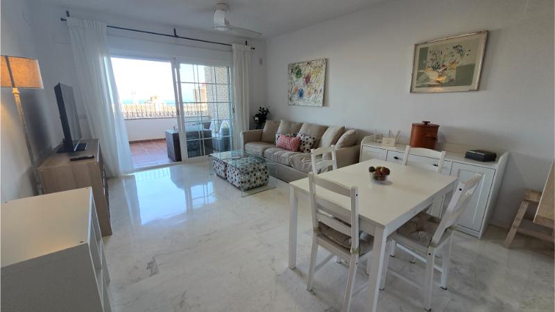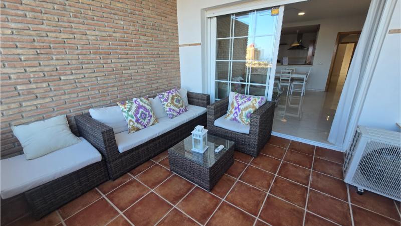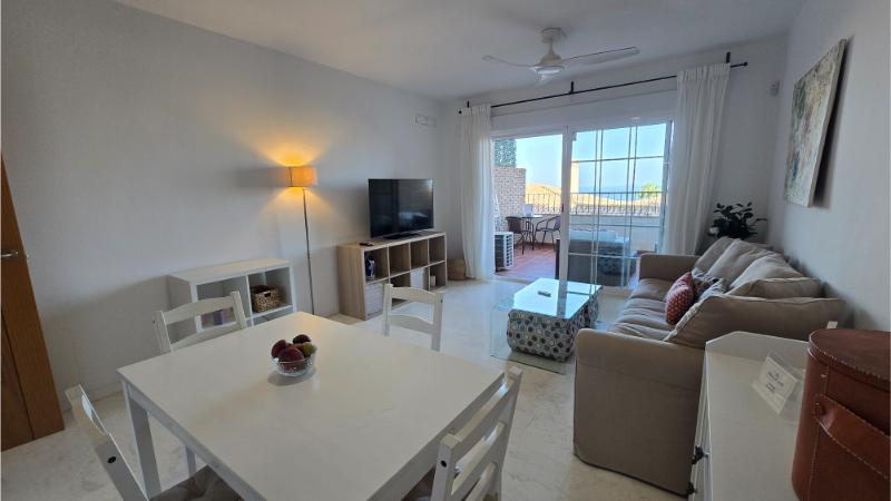 Desde el salón hay una salida directa a la terraza. La terraza tiene una mesa con 2 silliones y un banco. Hay una vista preciosa sobre el mar y hacia Almuñécar.