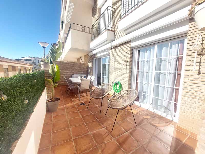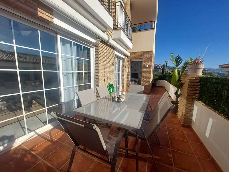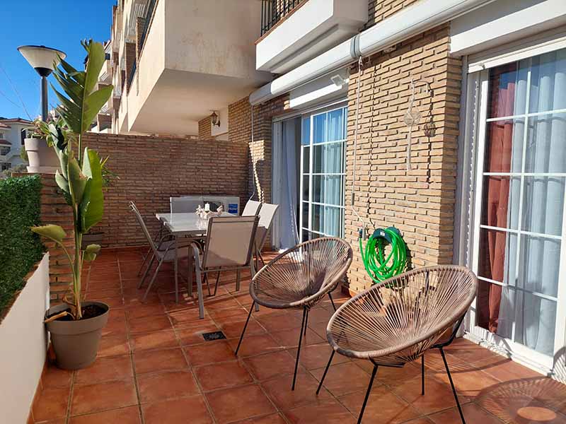 La terraza cuenta con dos toldos eléctricos y una mesa amplia con cuatro sillas, ideal para disfrutar de comidas al aire libre. Desde una parte de la terraza se puede apreciar una vista parcial al mar y hacia Almuñécar, que aporta un toque especial al espacio exterior.